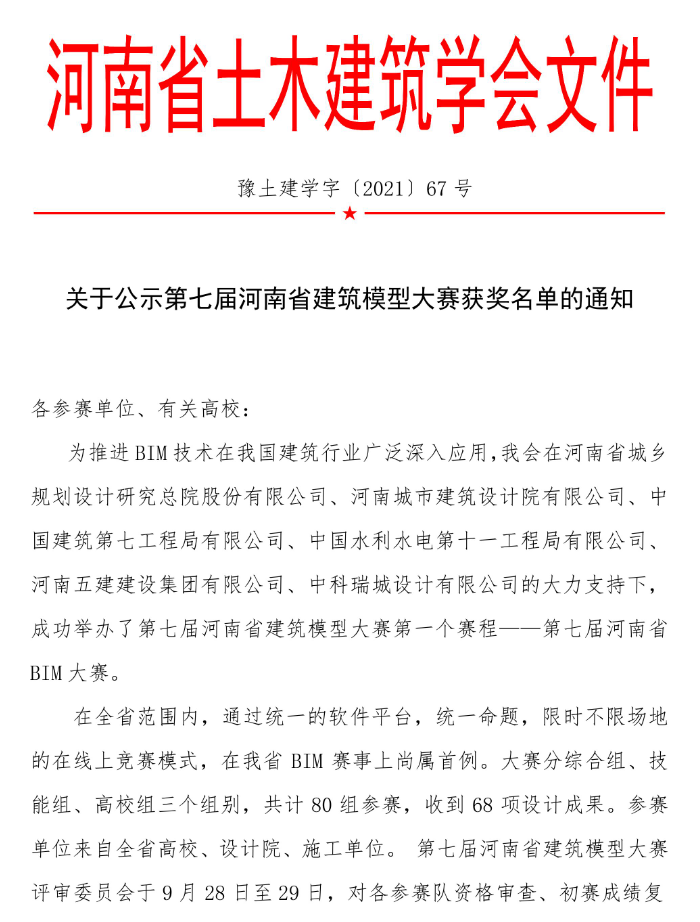 2021.10.09,9月30日,第七届河南省BIM大赛(BIM组)获奖名单公示,我司BIM参赛团队从大赛技能组队伍中脱颖而出,荣获三等奖。查看更多 >