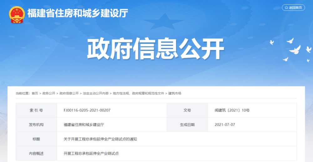 2021.08.05,关于开展工程总承包延伸全产业链试点的通知各设区市建设局、平潭综合实验区交建局:为深入贯彻落实习近平总书记来闽考察重要...查看更多 >