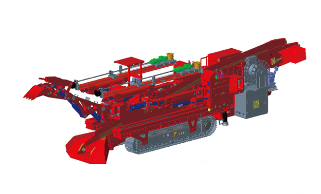 CMZY2-120/1 8煤矿用岩巷钻装机组是针对掘进工作面断面(宽度3.8m-5.0m, 高度3.5m-4.2m) 而设计的一款新型产品,本设备主要用于岩巷的炮采掘进工作面作业,具有钻孔、装载、运输等多功能于一体,不仅能实现巷道放炮钻孔、迎头探测孔的施工作业,还能快速装载和运输工作面爆破下来的落石,功能齐全,大大提高了岩巷的掘进效率,是煤矿巷道开口、硐室掘进等炮采工作面的必选设备。